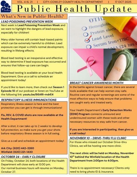 The Public Health Update is the City-Cowley County Health Department's twice-monthly publication focusing on the latest in public health. Each issue will be distributed to the community via social media and this website. With this format, we seek to better engage the community and bring into focus the many services that we provide. The updates will cover many topics including local and public health news, Health Department program highlights, upcoming events, and more!